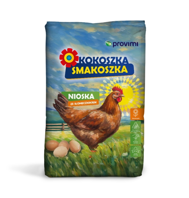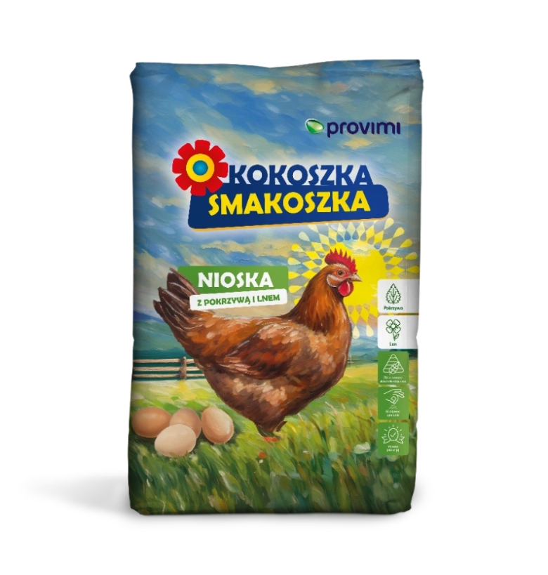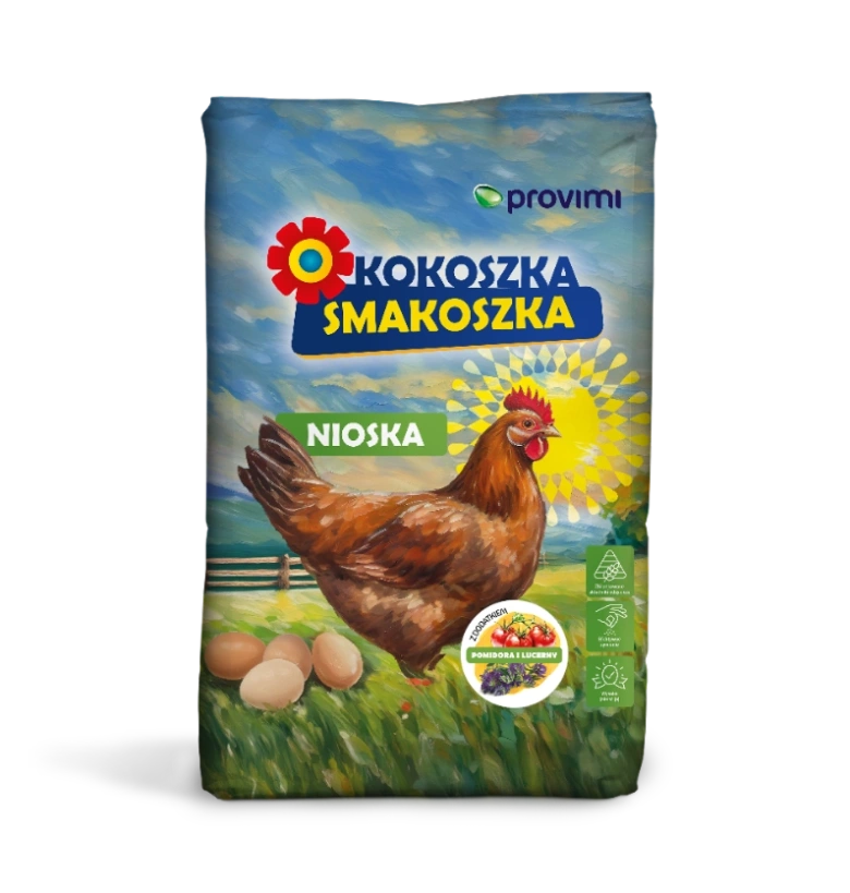 Produkty Kokoszki Smakoszki: Nioska, Nioska z pokrzywą i lnem, Nioska Strukturalna, Nioska z pomidorem i lucerną, Brojler 1 i 2, Kurczęta, Indyk 1, Kaczka i Gęś 1